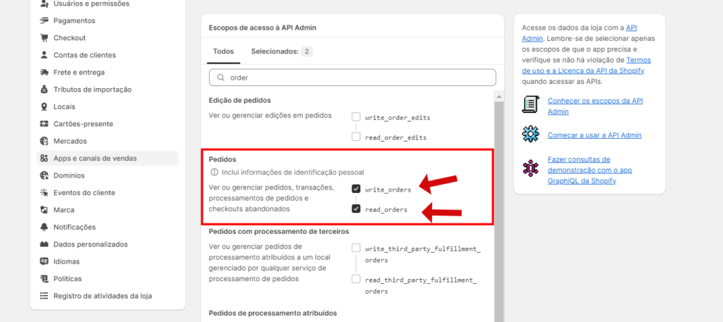 5) Pesquise por pedidos ou “orders” (a depender do idioma de sua loja) e selecione as duas opções conforme a imagem e lembre-se de clicar em “salvar”
